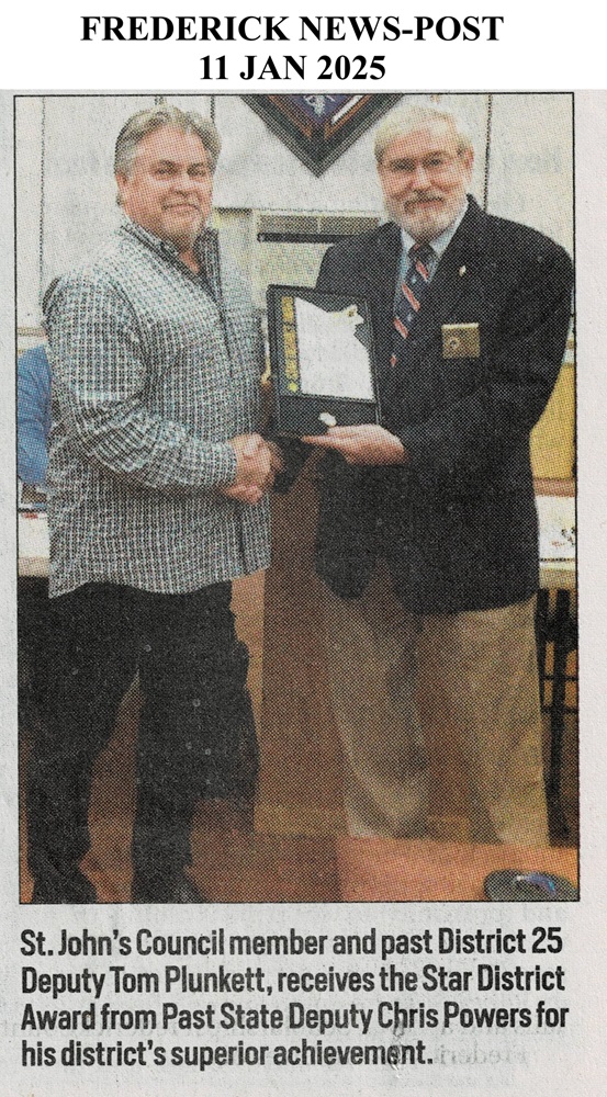 November 19, 2024. Former District Deputy (FDD) No. 25 Tom Plunkett, a current member and Past Grand Knight of St. John's Council 1622, was presented the "STAR DISTRICT AWARD" at the Nov 19 St. John's council membership meeting from the Maryland State Council for the recent 2023-2024 Fraternal Year. This is a prestigious award to District Deputies who provide continuous direct support for the Maryland State Council to a group of 4-5 individual councils.