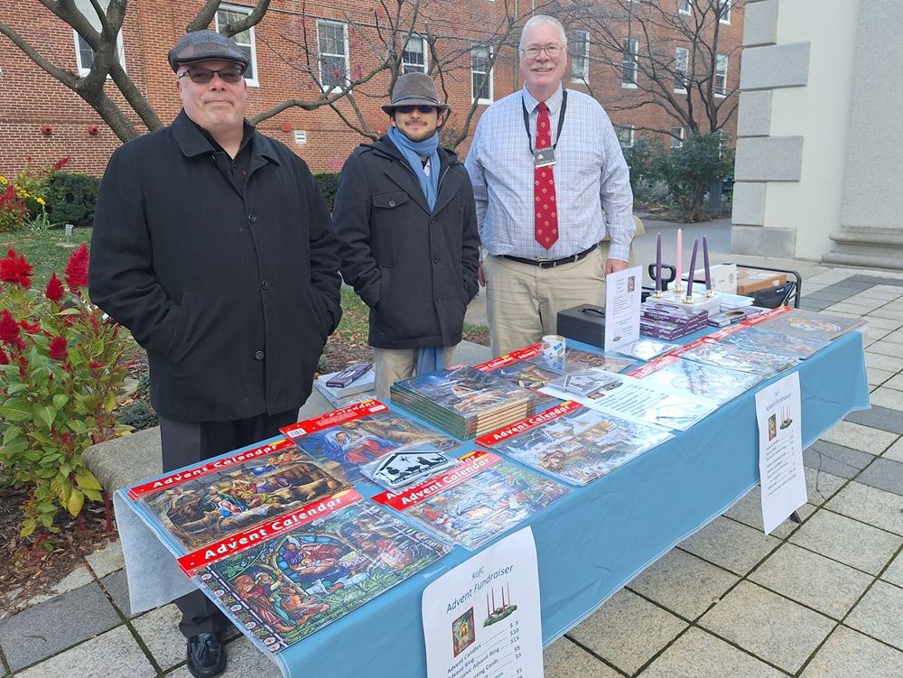 November 24, 2024. Knight sell Advent materials after Masses at St. John the Evangelist Catholic Church. Photo (LtoR): Br. Bill Sohm (event coordinator), Br. Mark Plavetic. and PGK Dave Satterfield.