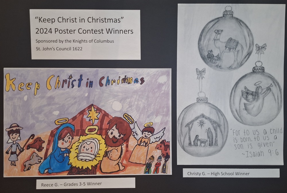 December 26, 2024. - Winning posters for our St. John's Council 1622's annual youth "Keep Christ in Christmas" poster contest are displayed to the public during the annual Frederick "Candlelight Tour of Historic Houses of Worship".