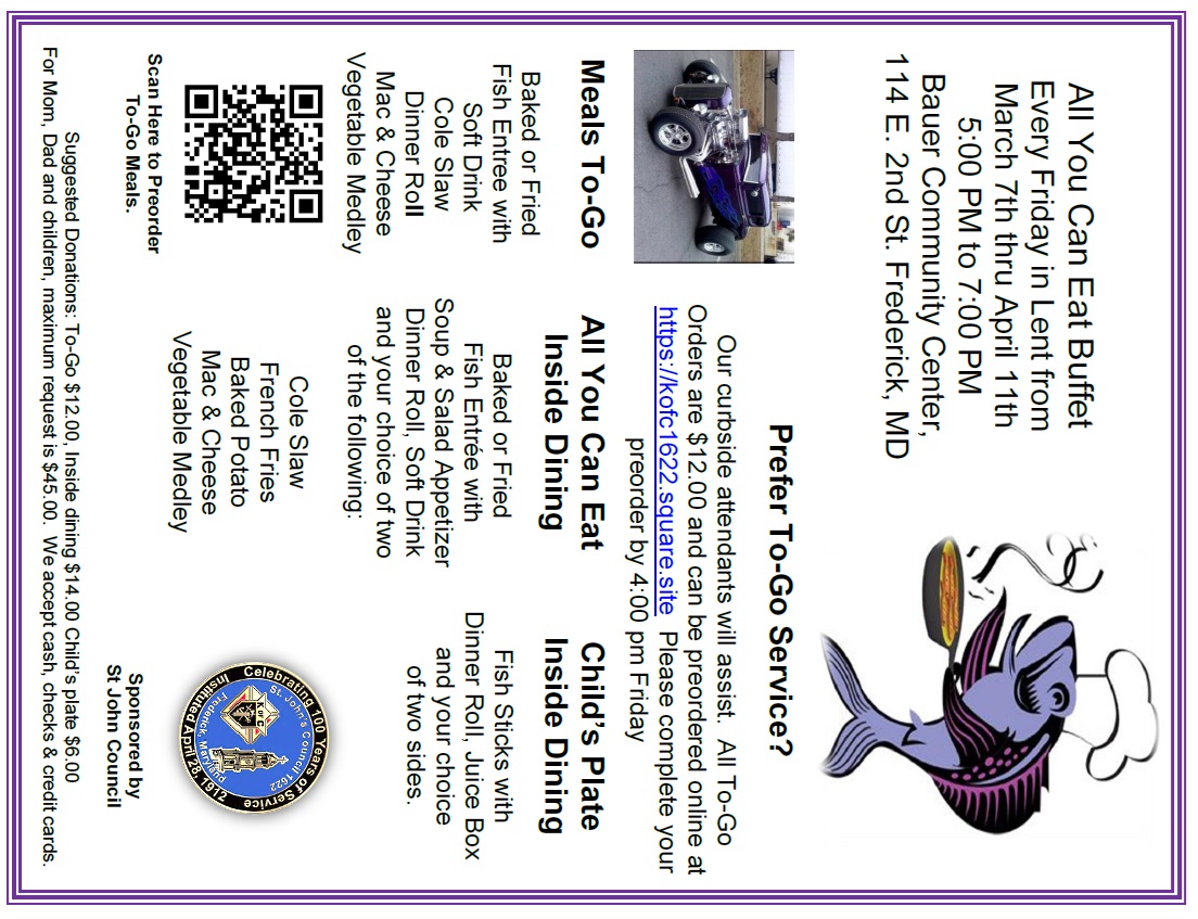 March 7, 2025. St. John's Council 1622 conducts our first 2025 Friday Lenten Fish Dinner at St. John the Evangelsi Church, Frederick, MD. Fish Fry Flyer.