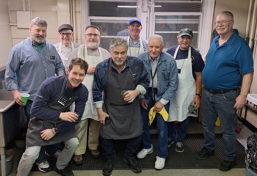 Photo (LtoR): In the kitchen, Br. Jimbo Cooper, Br. John Fischer (rear), Br. Peter Shuck (crouching), Br. Chris Charuhas, PGK Tom Plunkett (crouching), Br. Troy Kiessling, PGK Rick Casazza, Br. Maurice Wong (head chef), and PGK Dave Satterfield.