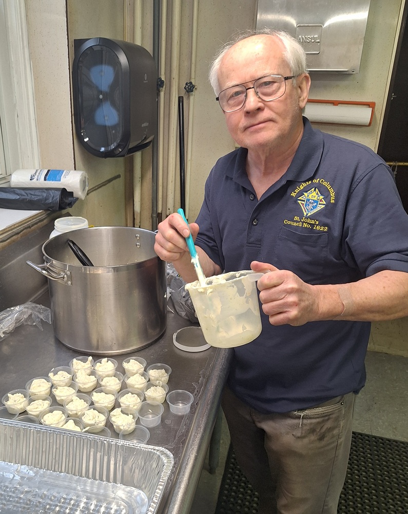 Thursday, March 13, 2025. Prep-work for our second St. John's Council 1622 2025 Friday Lenten Fish Dinner at St. John the Evangelsi Church, Frederick, MD. In the kitchen, PGK Michael Harrison makes tartar sauce.
