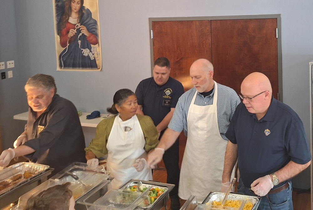Photo (LtoR): On the serving line, PGK Tom Plunkett, Karlene Wong, Br. Alex Sohm (in rear), Br. Scott Schittl, and Br. Bill Sohm.