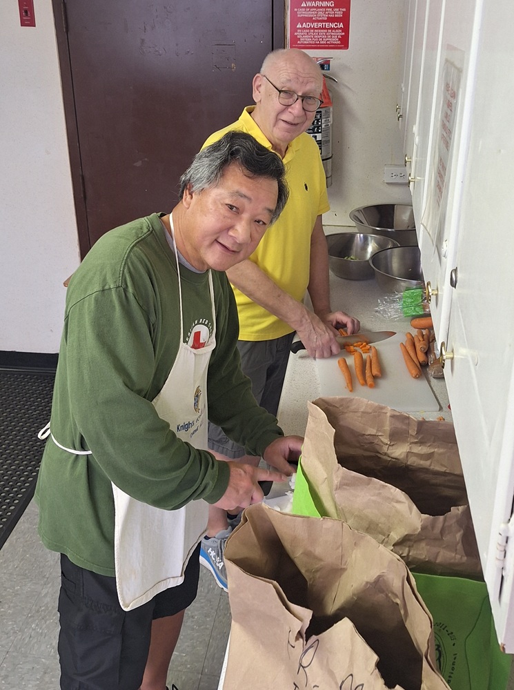 Sunday, March 30, 2025. Knights of St. John's Council 1622 prepare a meal for Fr. Matt DeFusco's Men's Formation Feast scheduled for April 1 at St. John the Evangelist Church, Frederick, MD. Photo (LtoR): Br. Maurice Wong and PGK Bob Krajewski.