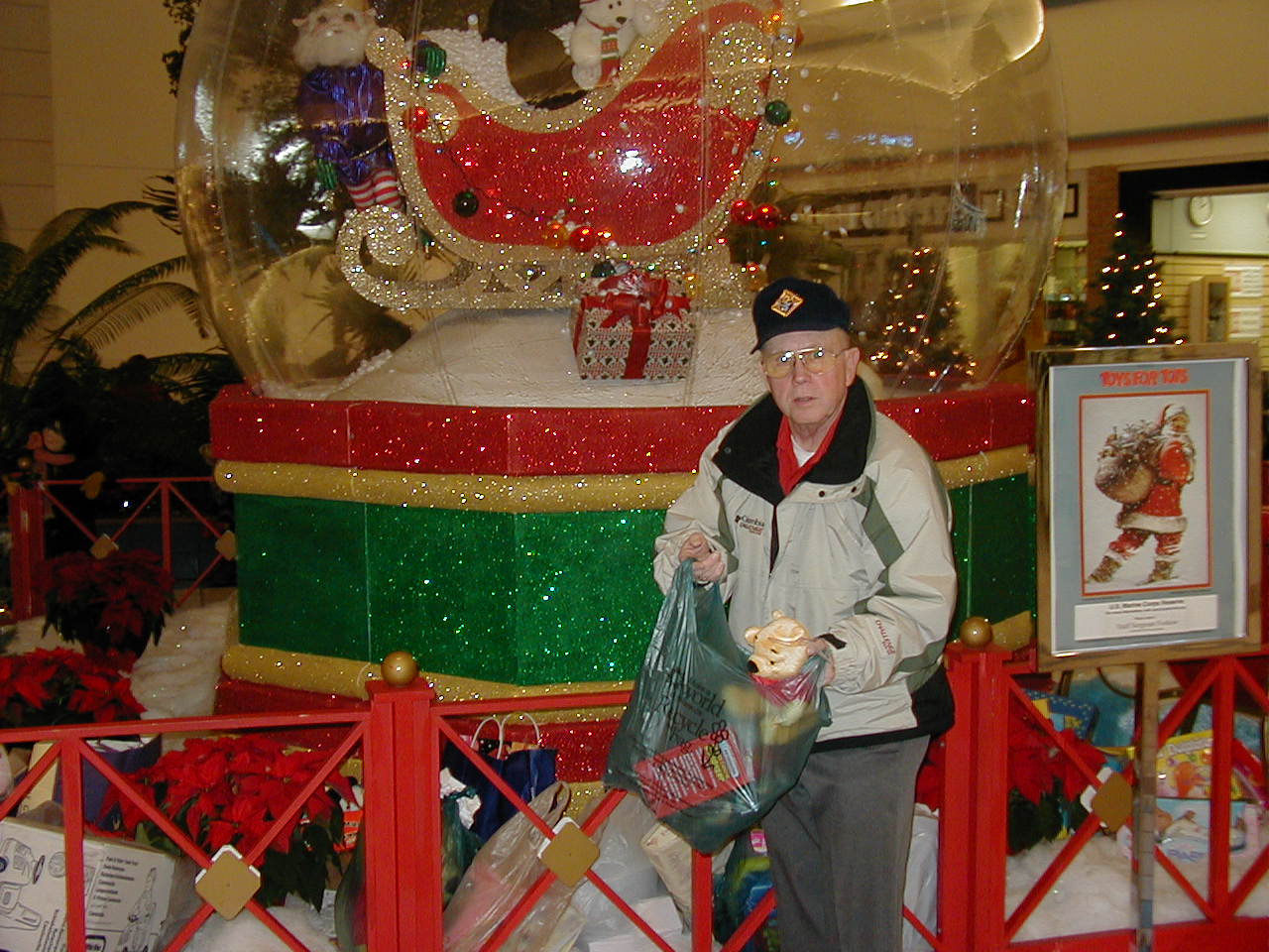 SK William Kinsella (Cncl 1622, Assy 384) delivers Assembly gifts to USMC Toys for Tots station.
