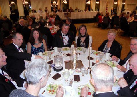 Clockwise from right: new SK Gary Heimes (Assy 384), SK Thomas Robinson (Assy 384, Cncl 11703) and his lady, new SK Edward Zanowicz (Assy 384, Cncl 11703) and his lady, Peggy Richards, PFN Dave Richards (Assy 384, Cncl 11703), PFN Bill Kinsella (Assy 384, Cncl 14011), PFN Bob Jack (Assy 384, Cncl 11703, facing away), and Ely Jack (facing away).
