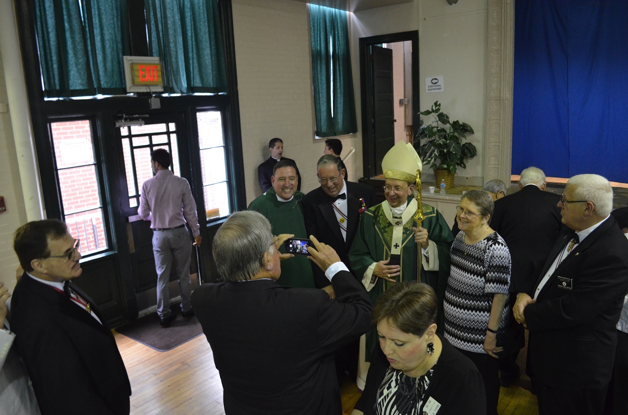 (LtoR) SK Ronald Torre (Assy 384, Cncl 12255, stands to left), PFN Lawrence Kmiecik (Assy 384, Cncl 12255, faces away with camera), Reverend Br. Kevin Farmer (Cncl 1622 Chaplain, Pastor of St. John the Evangelist Church), PFN/PSD Edgar Haynes (Assy 384, Cncl 11715), Archbishop Lori, Lisa Haynes, Deacon SK Doug Nathan (Assy 384 Assoc Friar, Cncl 1622 Assoc Chaplain), with Camille Torre in right foreground.
