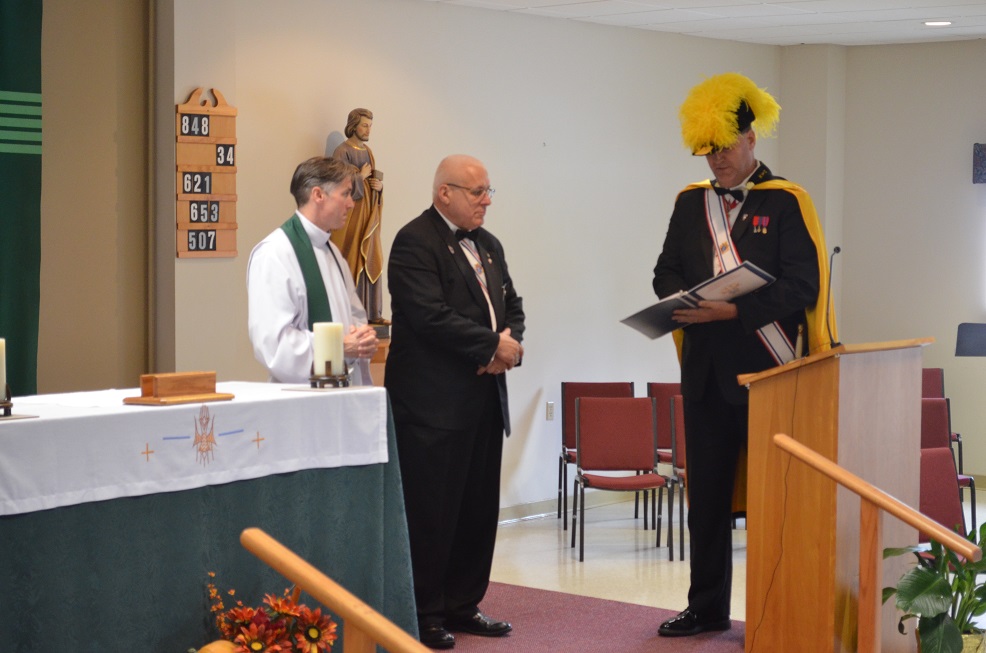 Rev. Colin Poston (Pastor, Our Lady of Mount Carmel and Saint Anthony Shrine Catholic Churches) and Deacon Doug Nathan (of St. John the Evangelist Church) recieve the charge of office as Friars for Assembly #3483 and Assy #384, respectively, from SK Ron Greul (Master of the Maryland Province in yellow chapeau).