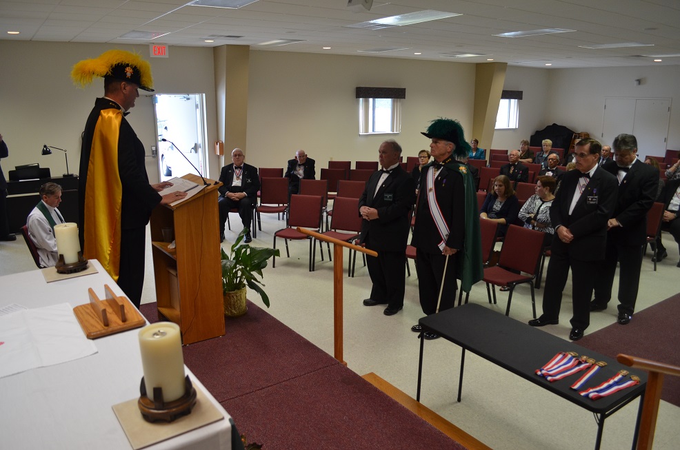 SK Ron Greul (Master of the Maryland Province in yellow chapeau) presents the charge of office to SK Allen Harris (Faithful Pilot Assy 3483), assisted by SK Tommy Ebaugh (Marshall for Maryland Province in green chapeau). SK Ron Torre (Faithful Navigator Assy 384) and SK Tom Plunkett (Faithful Captain Assy 384) stand to the right.