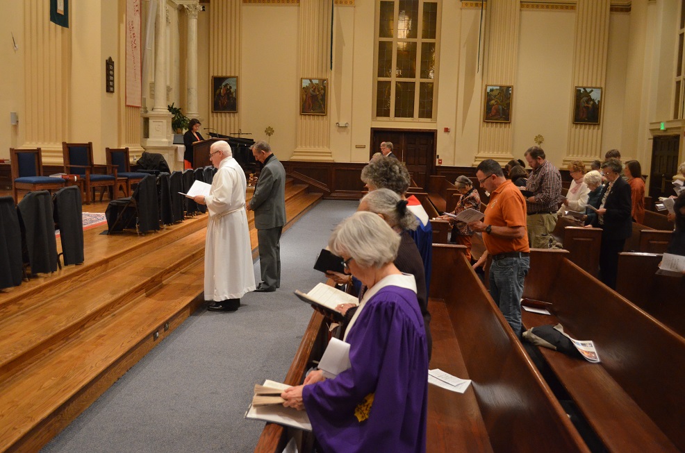 Deacon Doug Nathan, assisted by SK Pete Tokar, leads us in prayers during the memorial service.
