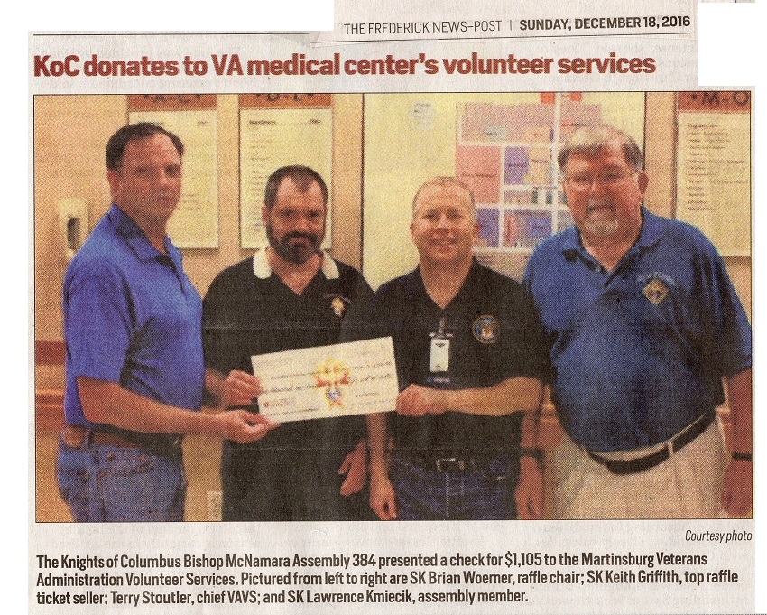 December 18, 2016, News Article - KofC donates to VA medical center's volunteer services.