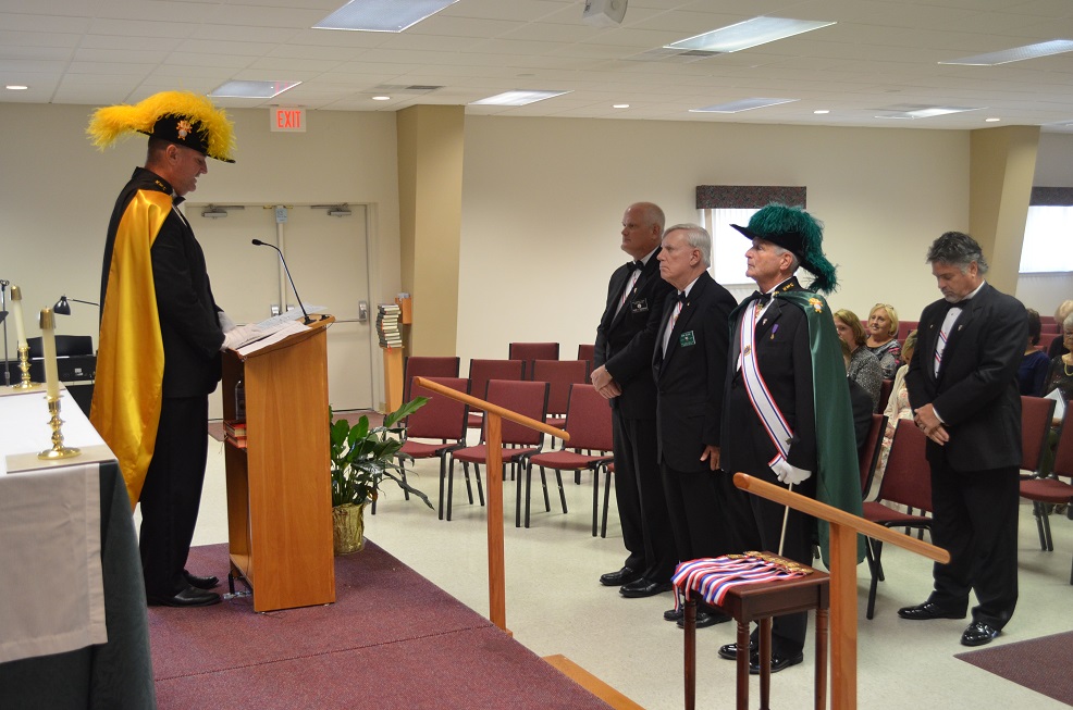 Maryland District Master, SK Tom Greul, in gold regalia, gives the charge of office to incoming officers, SK Dave Zakrzwski (Assembly 384) and SK Ken Allen (Assembly 3483). MD District Warden Tommy Ebaugh in green regalia.
