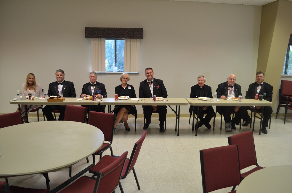 Follow-on reception and dinner. Seated at the head table (LtoR), Janet Plunkett, FN Tom Plunkett (Assy 384), unidentifiesd Sir Knight, lady with Tom Greul, Maryland District Master Tom Greul, Rev. Collin Poston, Deacon SK Doug Nathan (Assy 384), FN Jesse Stansbury (Assy 3483).