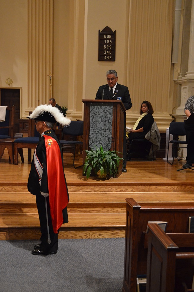 Grand Knight Raul Canaviri (Cncl 14726) addresses the attendees. SK Querido Cerezo in foreground as Color Corp member. Vangie Quiambao sits in rear as Cantor.