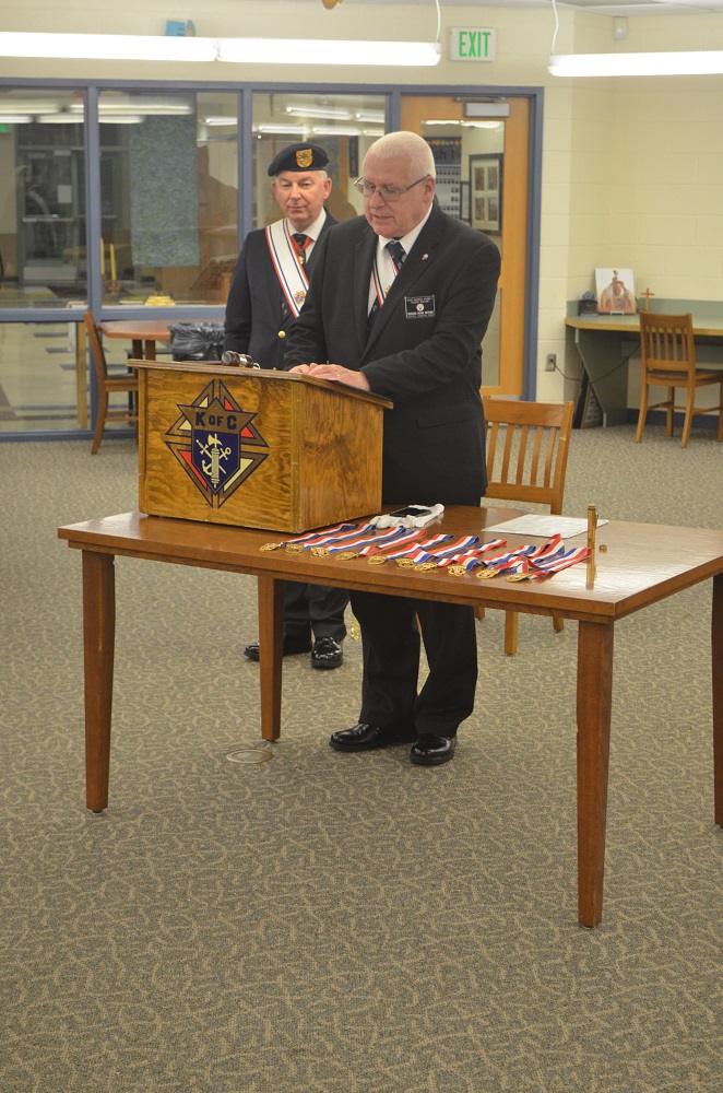Deacon SK Doug Nathan blesses the ceremonial jewels and Maryland District Master of the 4th Degree, SK Francis (Fritz) Leach, observes.