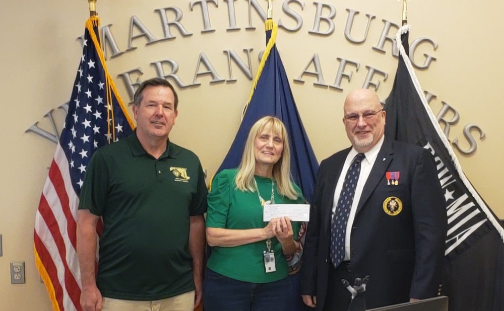 August 22, 2023. Faithful Admiral PFN Lee Ericksen (left) nand Immediate Past Faithful Navigator Dirk Griffin (right) presented a check to Ms. Terri Martin (center), Volunteer Service Specialist in support of the VAVS (Veterans Administration Volunteer Services) at the Martinsburg VA Medical Center, Martinsburg, West Virginia. The $1,500 donation was raised by the Worthy Sir Knights of Bishop McNamara Assembly 384 and continues the annual contribution made in support of our nation's veterans. The money will support the needs of their patients for things like toiletries, haircuts, other personal care assistance, and other needs.