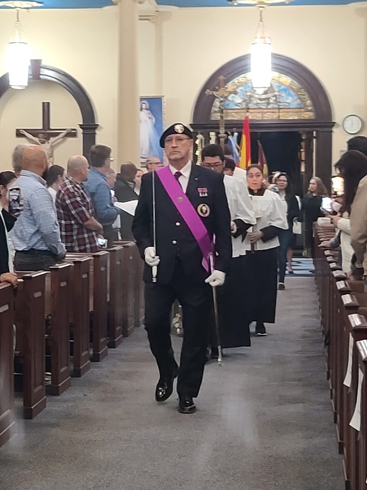 October 12, 2023. Bishop McNamara Assembly member and Color Corps Commander, PFN Walter Leskuski, leads the procession for the Mass for Our Lady of the Pillar in St. John the Evangelist Church, Frederick, MD.