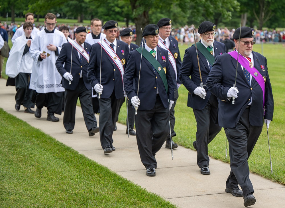 June 6, 2024, The Bishop McNamara Assy 384 color corps and other color corps members serve at National Shrine of Saint Elizabeth Ann Seton in Emmitsburg, MD for the National Eucharistic Pilgrimage. After a Mass in the Shrine by Archbishop William E. Lori, the color corps escort a eucharistic pilgrimage from the Shrine into downtown Emmitsburg and return.