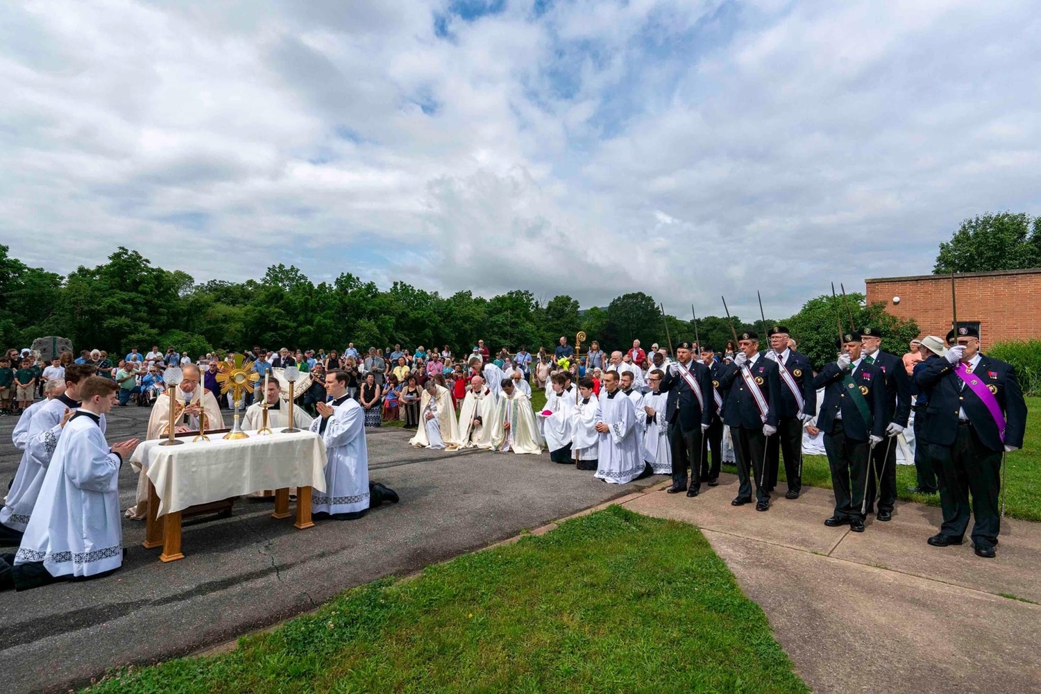 June 6, 2024, The Bishop McNamara Assy 384 color corps and other color corps members serve at National Shrine of Saint Elizabeth Ann Seton in Emmitsburg, MD for the National Eucharistic Pilgrimage. After a Mass in the Shrine by Archbishop William E. Lori, the color corps escort a eucharistic pilgrimage from the Shrine into downtown Emmitsburg and return.