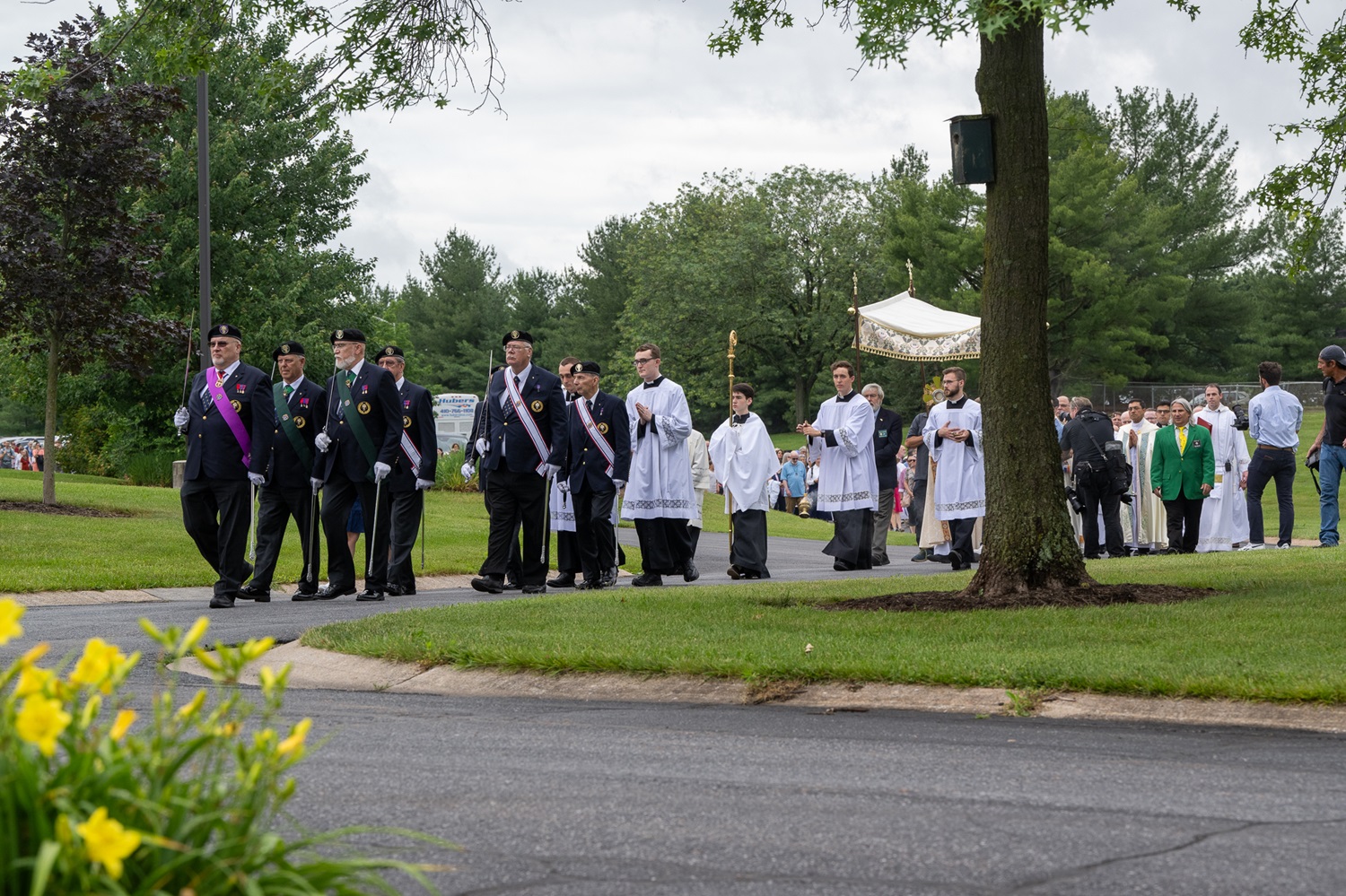 June 6, 2024, The Bishop McNamara Assy 384 color corps and other color corps members serve at National Shrine of Saint Elizabeth Ann Seton in Emmitsburg, MD for the National Eucharistic Pilgrimage. After a Mass in the Shrine by Archbishop William E. Lori, the color corps escort a eucharistic pilgrimage from the Shrine into downtown Emmitsburg and return.