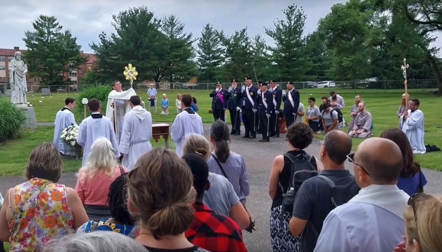 June 6, 2024, The Bishop McNamara Assy 384 color corps and other color corps members serve at National Shrine of Saint Elizabeth Ann Seton in Emmitsburg, MD for the National Eucharistic Pilgrimage. After a Mass in the Shrine by Archbishop William E. Lori, the color corps escort a eucharistic pilgrimage from the Shrine into downtown Emmitsburg and return.
