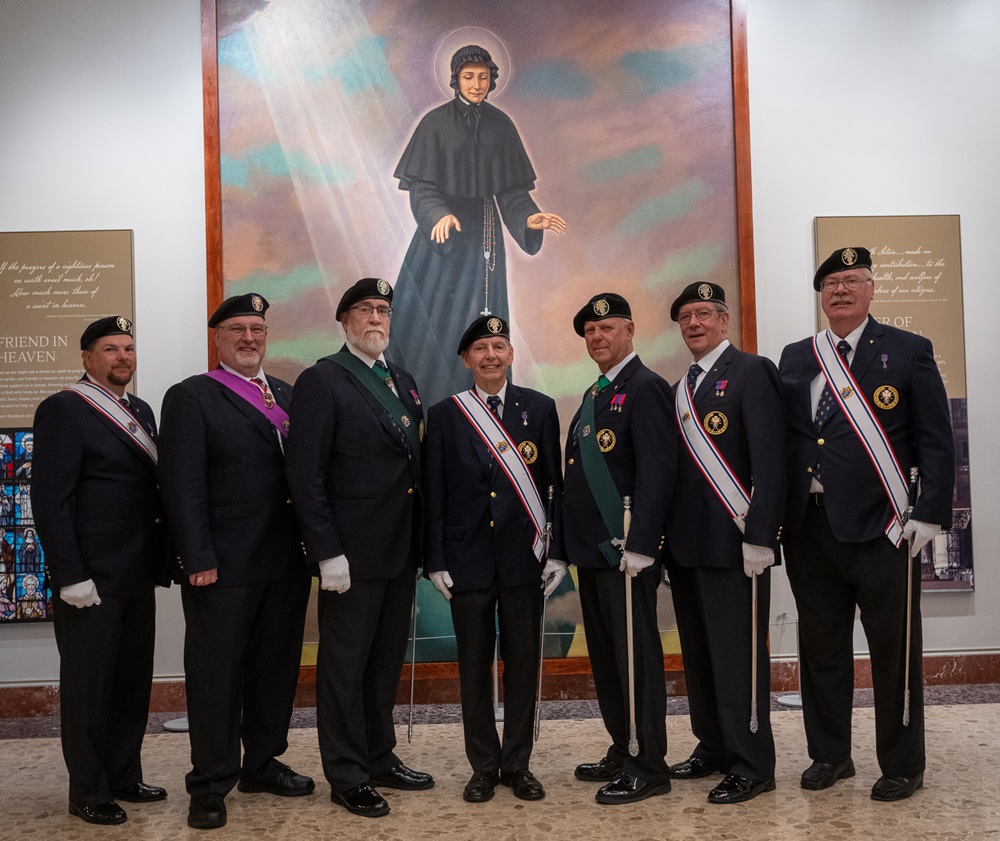 After the Eucharistic Pilgrimage, the oolor corps stands in front of a St. Elizabeth Ann Seton painting in the Shrine. (LtoR): SK Tom Robinson (Assy384), PFN Dirk Griffin (Assy384), SK Marty Nau, an unidentified Sir Knight, SK Tom Partinoe, SK Kevin Quinn, and SK Dave Satterfield (Assy384).