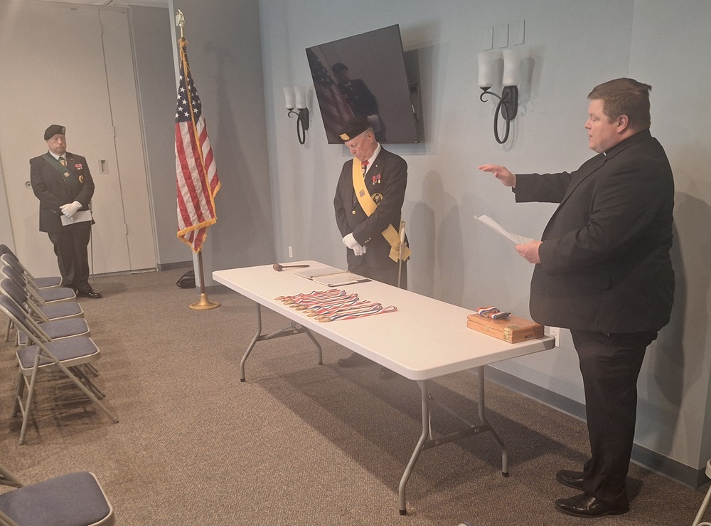 (LtoR) District Marshal Richard Przybylski and Maryland District Master James E. Duryee observe as Faithful Friar Rev. Matt Buening (Pastor, St. Katherine Drexel Church) blesses the ceremonial officers jewels.