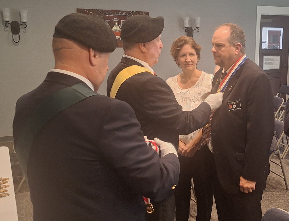 (left to right): District Marshal Richard Przybylski observes while District Master James E. Duryee presents the jewel of office to Faithful Captain Thomas J. Robinson. His wife, Jeannette Robinson, observes from the rear.