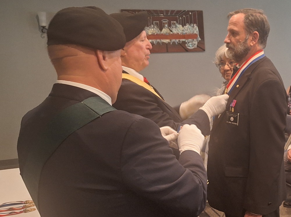 (left to right): District Marshal Richard Przybylski observes while District Master James E. Duryee presents the jewel of office to Faithful Scribe Brian E. Woerner. His wife Irma Woerner observes from the rear.
