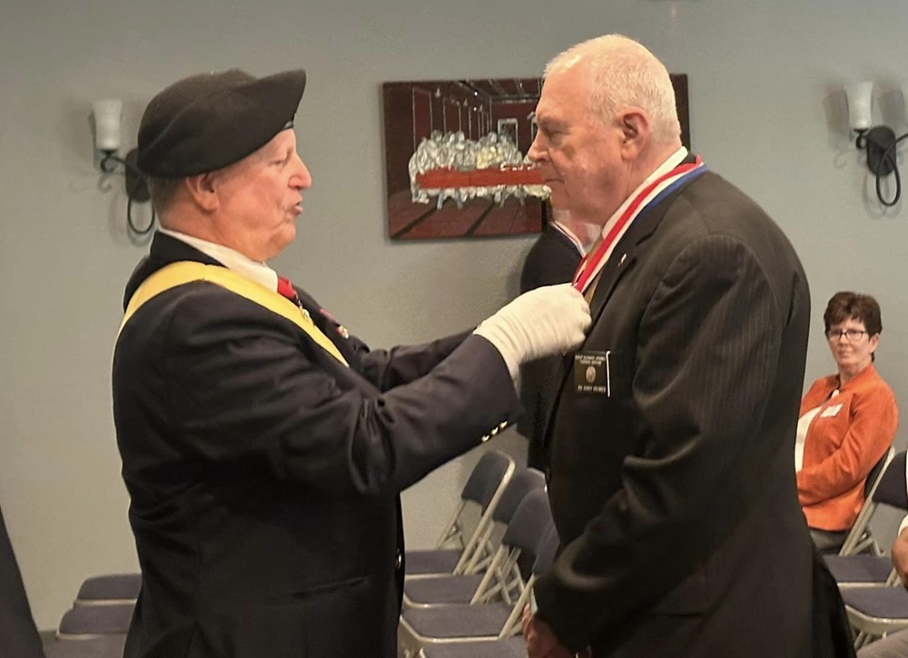 (left to right): District Master James E. Duryee presents the jewel of office to Faithful Inner Sentinel Gary Heimes. Cindy Satterfield, wife of SK Dave Satterfield, observes from the rear.