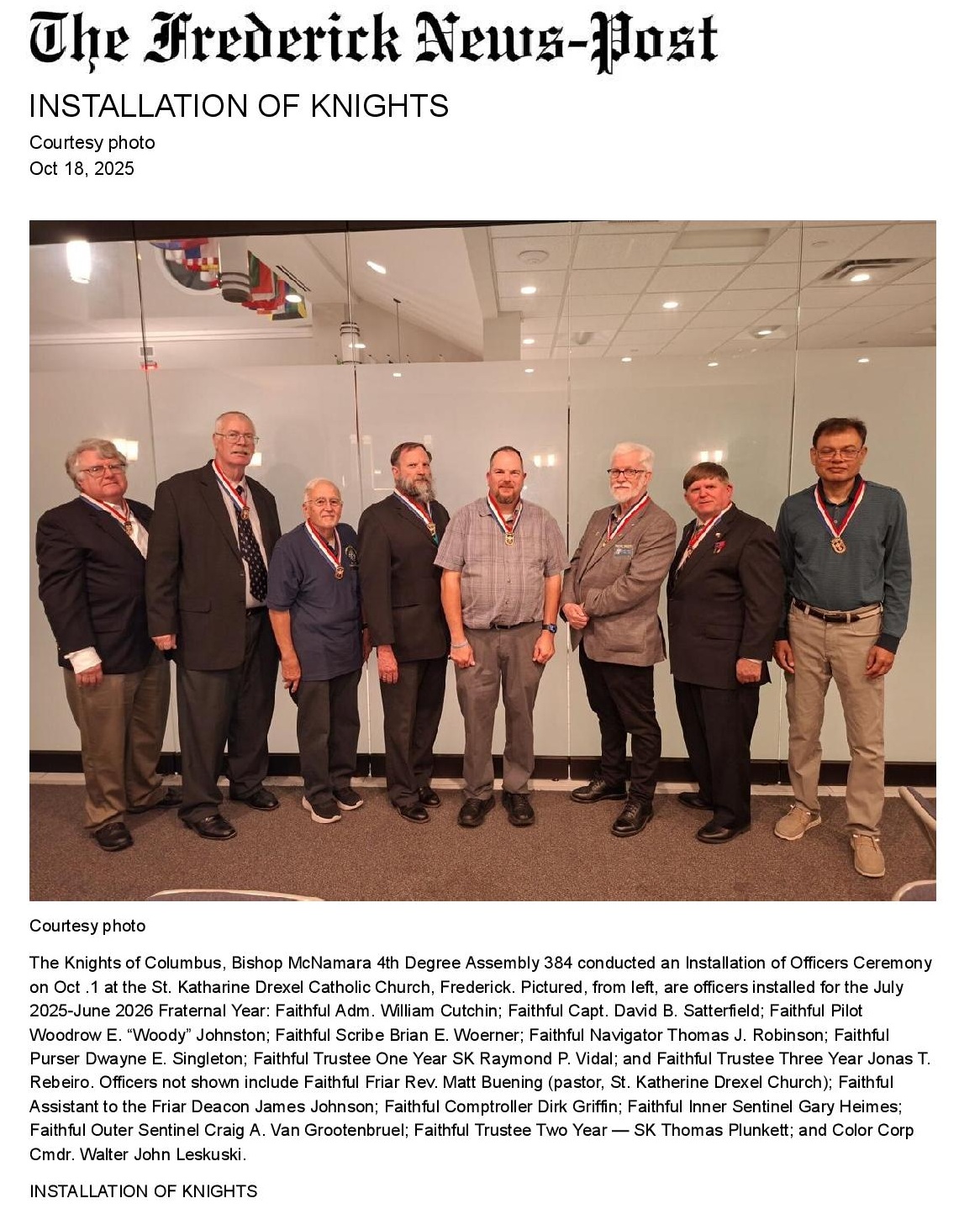 October 1, 2025, the Knights of Columbus, Bishop McNamara 4th Degree Assembly 384, conducted an Installation of Officers Ceremony at the St. Katharine Drexel Catholic Church, Frederick, MD.